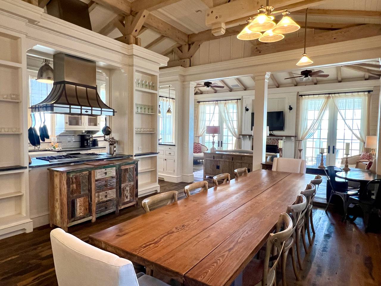 Large wooden dining tables in both houses invite the crew to gather around when it's time to break bread together, served from the adjacent gourmet kitchens. Dining areas extend into the main living areas of each house, furnished with comfort in mind, and complete with entertainment and media features.