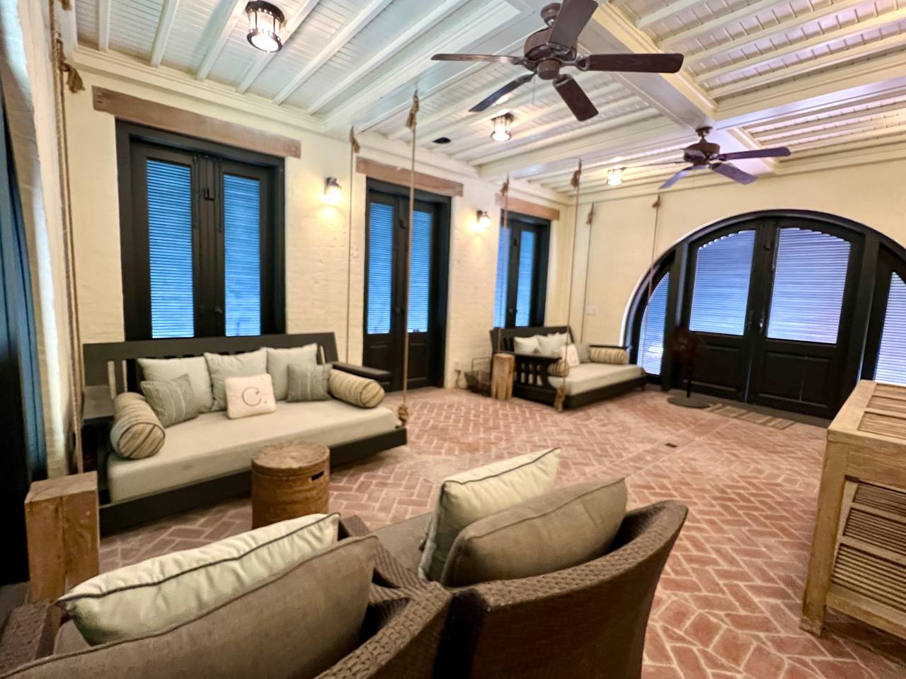 The porches are attractive living spaces, feeling almost indoor, large and comfortable enough to share a meal at table, to relax in front of a real wood-burning fireplace in either porch, to laze on the bed-swing, or sprawl and let time go its own way. Opening out from several bedrooms, Juliet balconies provide nooks for morning coffee or evening relaxation.