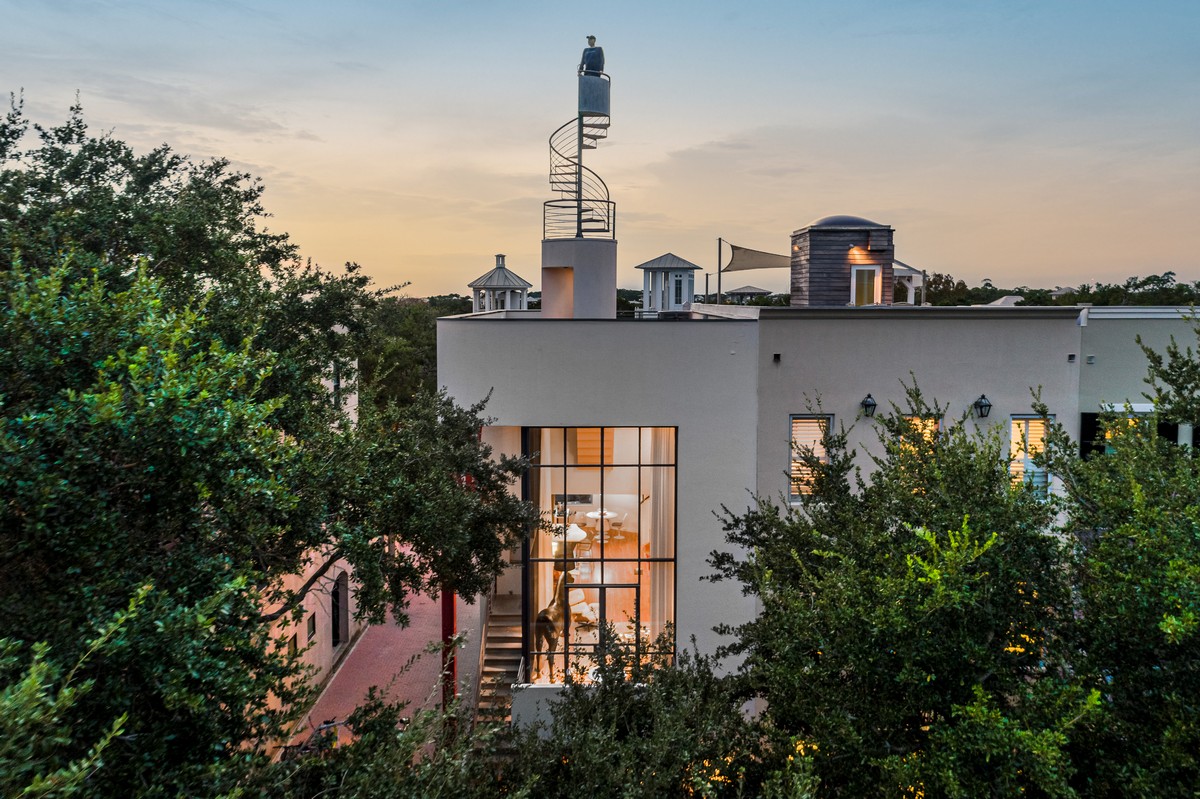 Stairway to Heaven vacation home is a unique icon in Seaside, remarkable even in this town known for its uniqueness. It's an architectural achievement that feels like living inside a work of art, fantastically modern yet immersed in nature, set on the corner of Ruskin Place Park, overlooking and opening out into the shaded tranquility of that lovely park. The setting is right in the heart of Seaside, but cloistered away from the bustle, and above the fray, with its own private driveway.